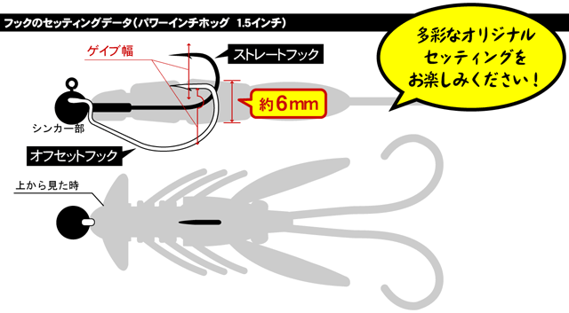 またテールの向きも縦型に変更し、且つ大きめのテールを持つ事でより水をつかむ威力が増し、バスへのアピール力を強化! ジグヘッド、テキサスリグ、スプリットショット、キャロライナリグ等いろいろなリグに対応可能!新カラー6色で登場です! (メーカーサイトより) バークレー パワーベイト ワームのサイズ比較についてはこちらを参考にして下さい ≫【ワーム】 パワーベイト パワーインチホッグ 1.5インチ GPBF グリーンパンプキンブルーフレック DATA <全長> 1.5インチ(約42mm) <入数> 8本入り <胴体部体高> 6mm <味・ニオイ> 有り <1本の重さ> 約1.1g 注1)「全長」「重さ」「体高」などの計測値は、実際の商品と若干異なる場合がありますので、あくまで目安としてご利用ください。